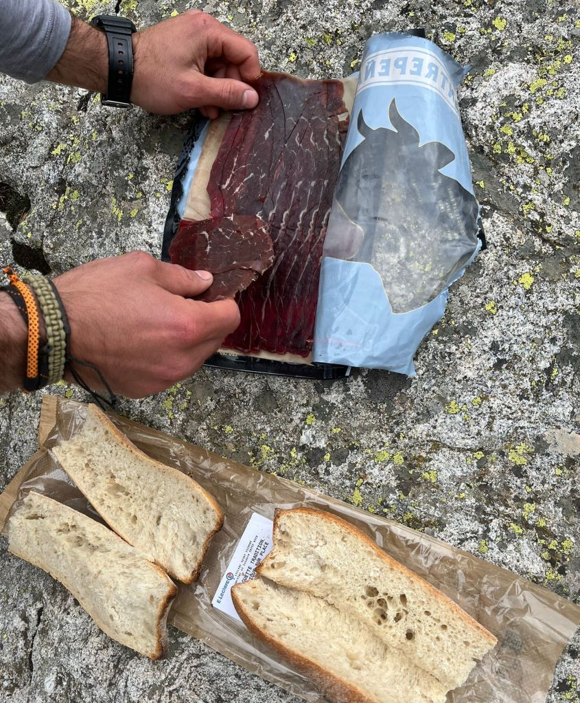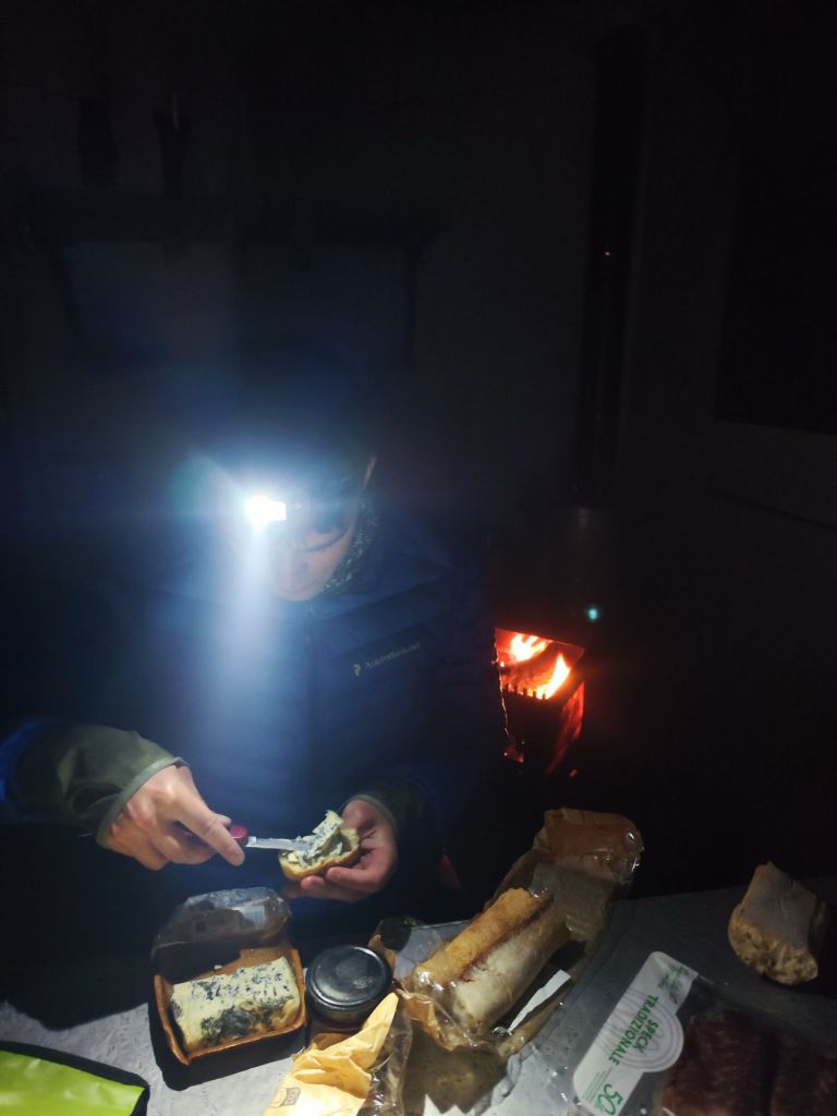 Una vez dentro encendimos la lumbre y sacamos material para comer. Nos ventilamos una baguette untada con queso de cabra y mermelada, de las mejores cosas que he probado en mi vida, sobre todo después de tal odisea.
