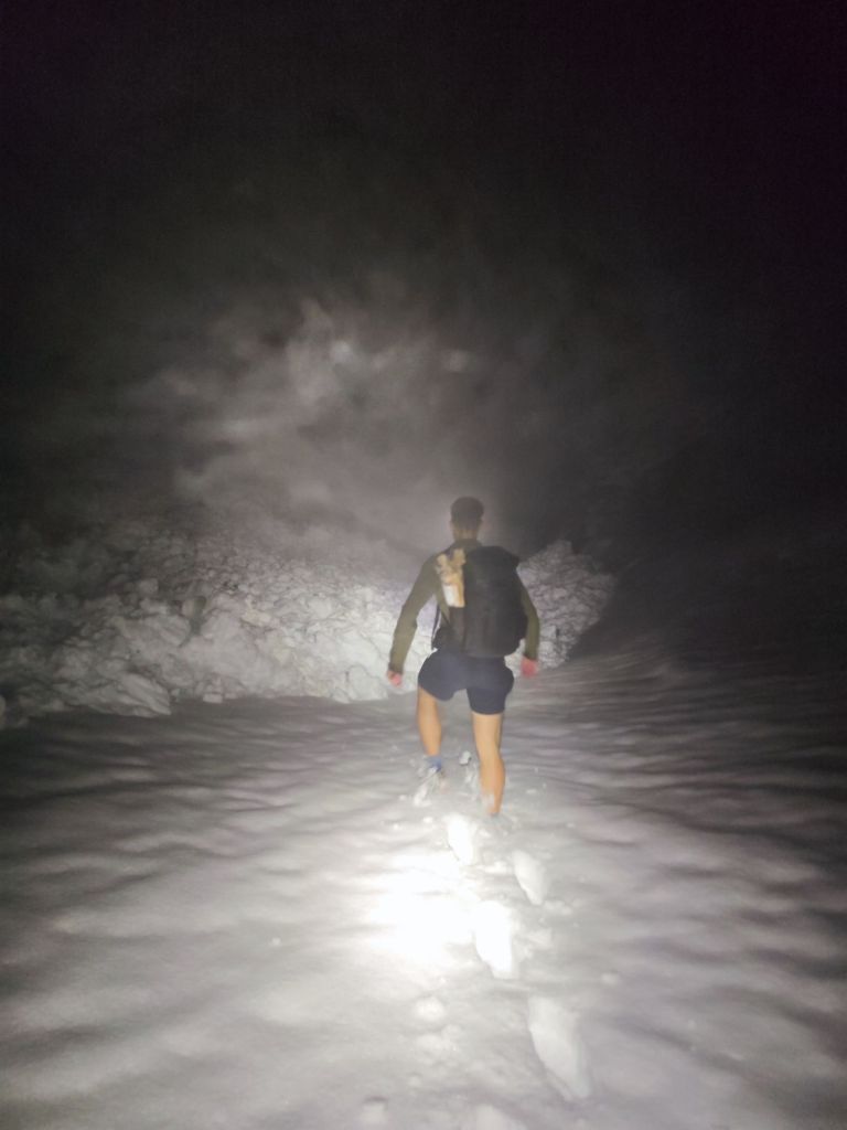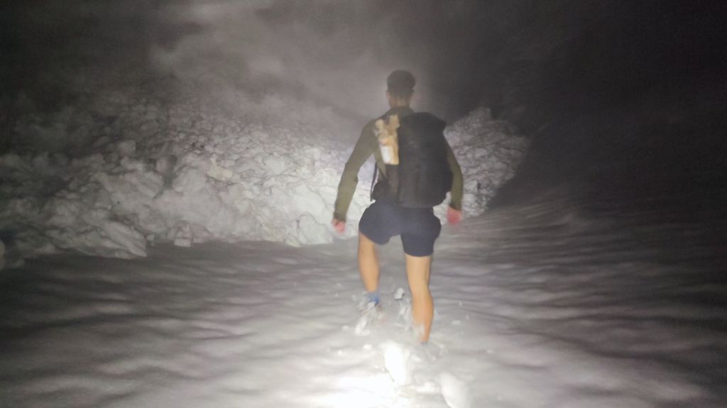 Volvimos a la senda correcta y seguimos avanzando lentamente. La cantidad de nieve era mayor de lo que esperábamos y las avalanchas caídas durante el día dificultaban el paso. Llevábamos tres horas caminando, el frío empezaba a sentirse, cosa que también notaban las tibias de Raúl, que tuvo la brillante idea de ir en pantalones cortos (nótese la ironía).
