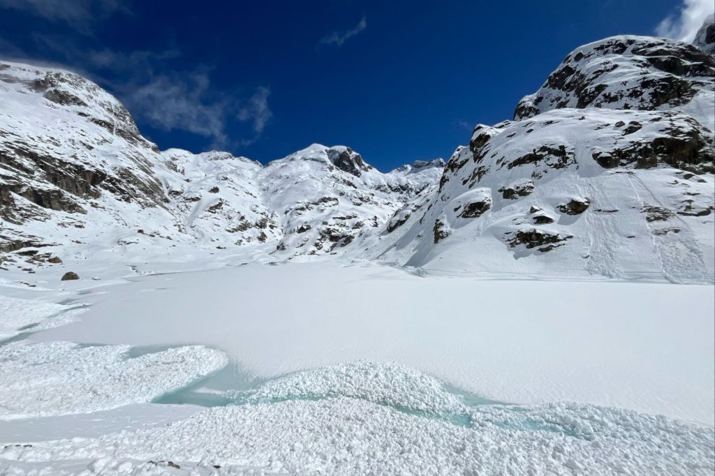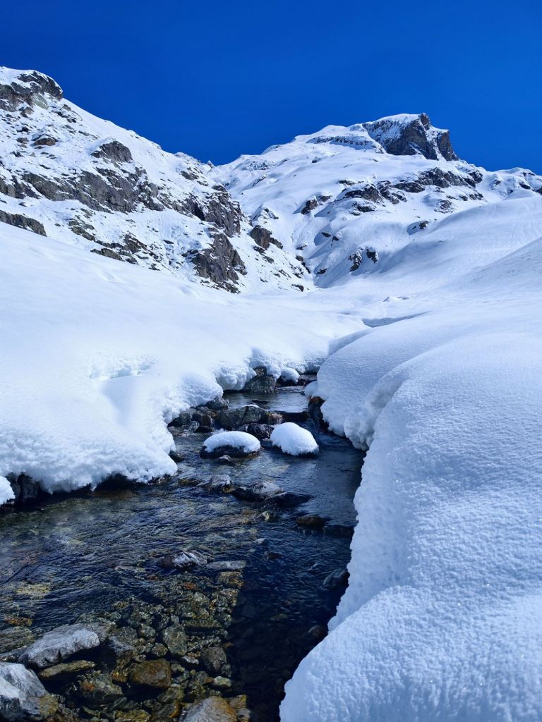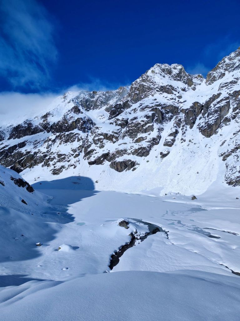 Llegamos al Lac de la Fous y, con cuidado, lo fuimos bordeando por el lado oeste, ya que se hacía difícil intuir dónde estaba su orilla. Tras cinco horas, nos pareció ver a lo lejos el refugio. Por un momento nos cambió la cara y el cuerpo se tranquilizó un poco. El camino se hizo delicado, teniendo que atravesar riachuelos escondidos bajo la nieve.