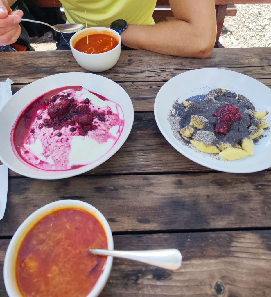 Comimos con ganas: gnocchis con semillas de amapola, un mazapán con frutos rojos y yogur rebosando por encima y un par de sopas. Estábamos más para siesta que para caminar, pero queríamos intentar subir al pico más alto de Polonia antes del anochecer.