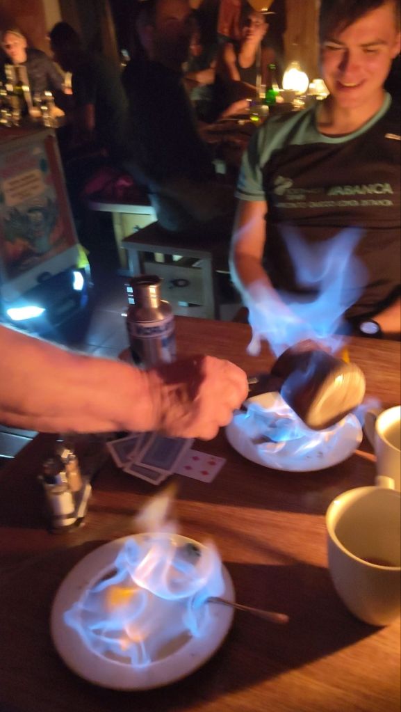 La cena fue espectacular: cumpleaños incluido y un paisano con ganas de quemar todo lo que pillaba, rociándolo con ron y prendiéndole fuego. Para cerrar el día, un vasito de medovina y a la cama.
